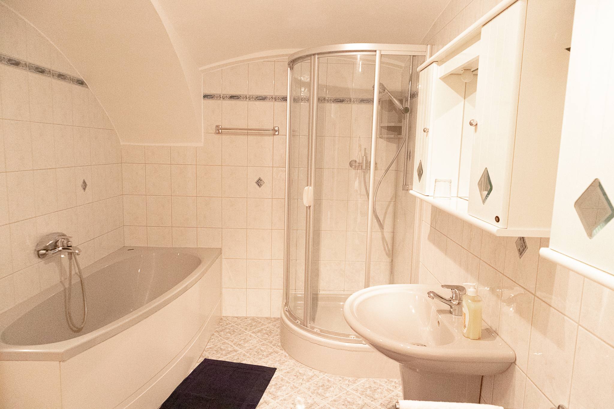 - Badezimmer (Badewanne, Dusche, 2 Waschtische, Föhn, Waschmaschine, Dusch- und Badetücher)